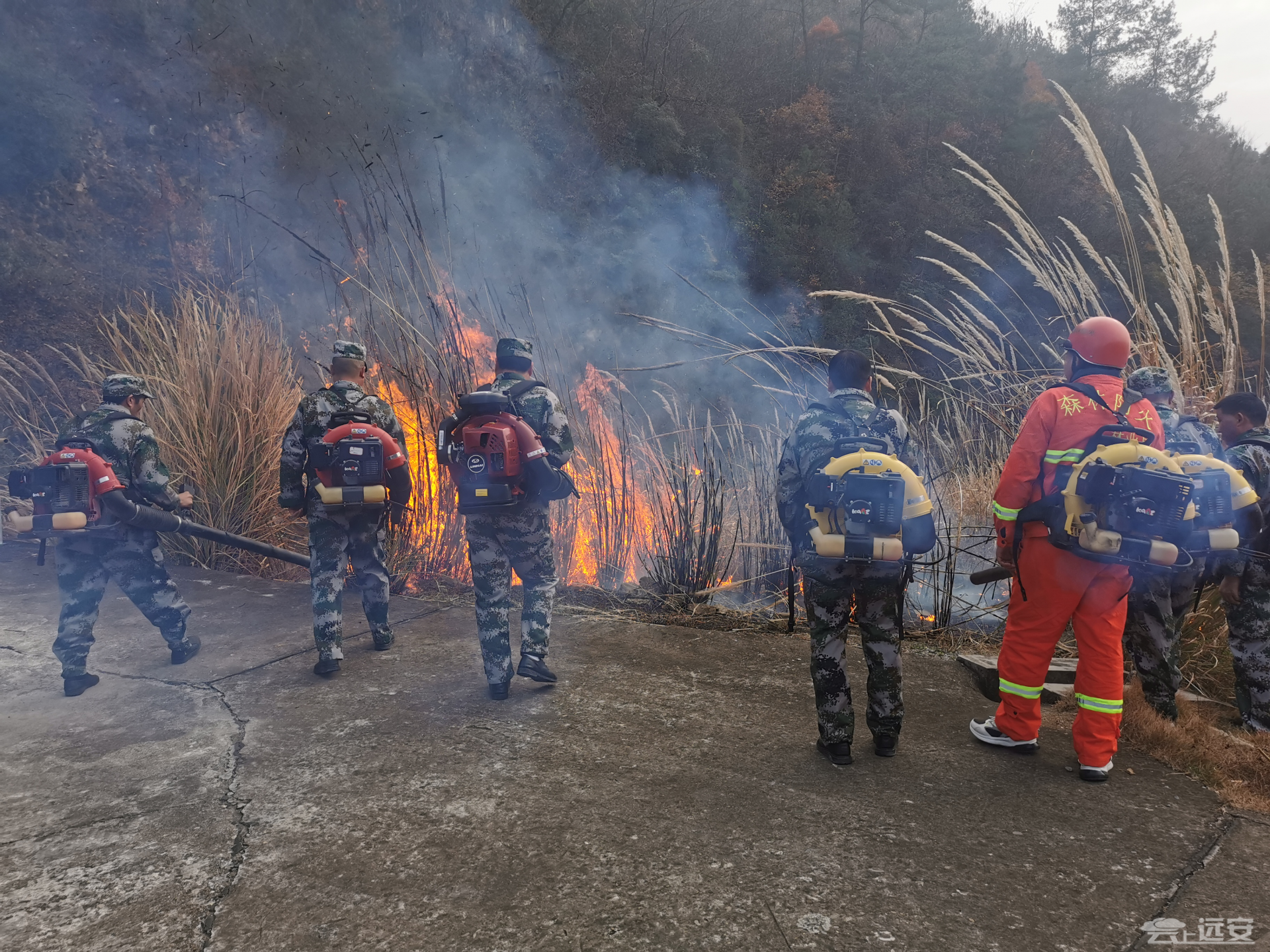 培训会后,县消防救援大队组织参会人员开展了灭火实操演练,演练现场以突发森林火灾为模拟事件,应急扑火队员接到火灾报警紧急集合,赶往火灾现场进行扑救,先后使用风力灭火器、消防车等灭火设备,对模拟火场进行打火清场、余火清理、现场留守等作业,积极阻断火势发展,逐步将大火化小,防止死灰复燃引起火灾。整个过程井然有序,队员分工明确、反应迅速、配合默契,达到了较好的效果。