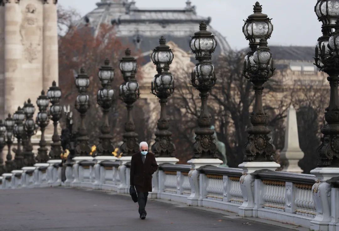 一名戴口罩的男子走在法国巴黎亚历山大三世桥上。高静摄(新华社)