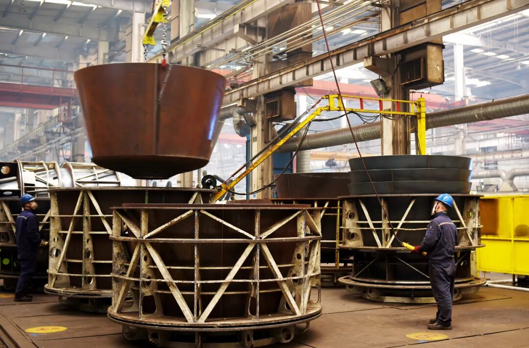 河北宣化经济开发区的福田重机有限公司工人在搅拌车焊接生产线上工作。陈晓东摄(中经视觉)