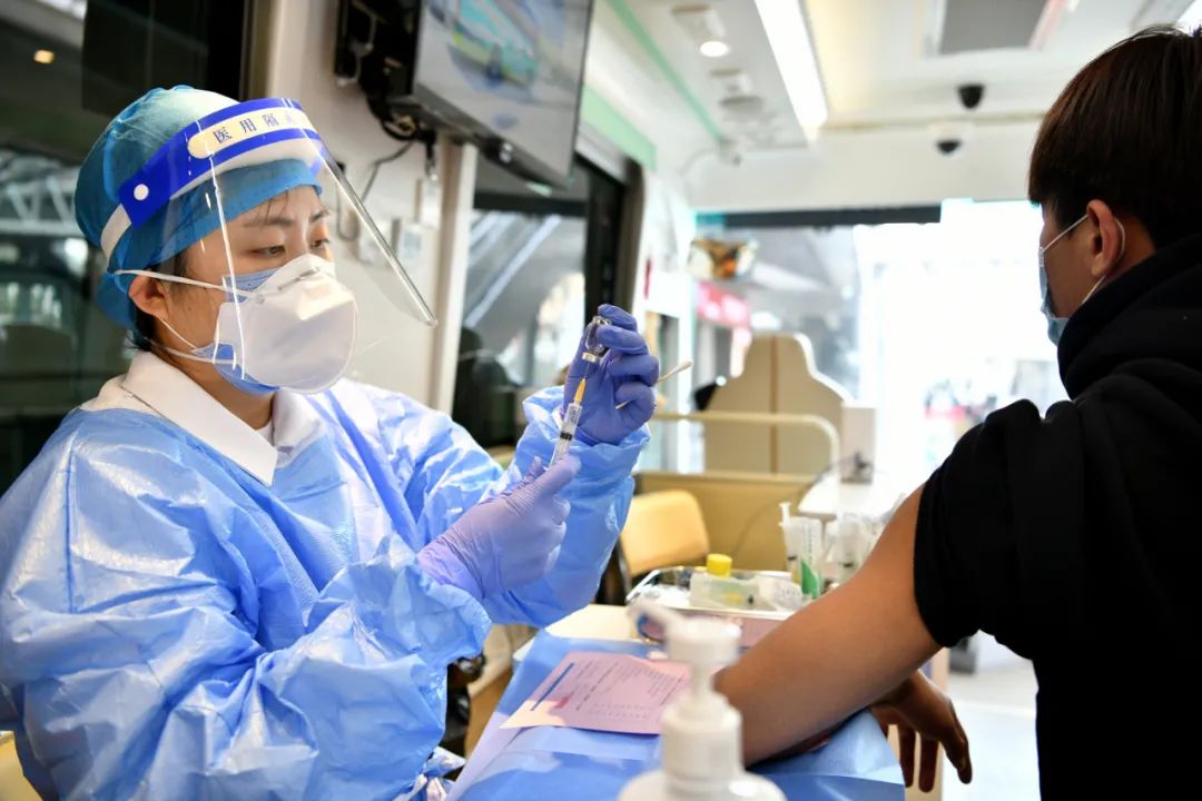 4月7日,医护人员在移动疫苗接种车上进行接种准备工作。李鑫摄(新华社)