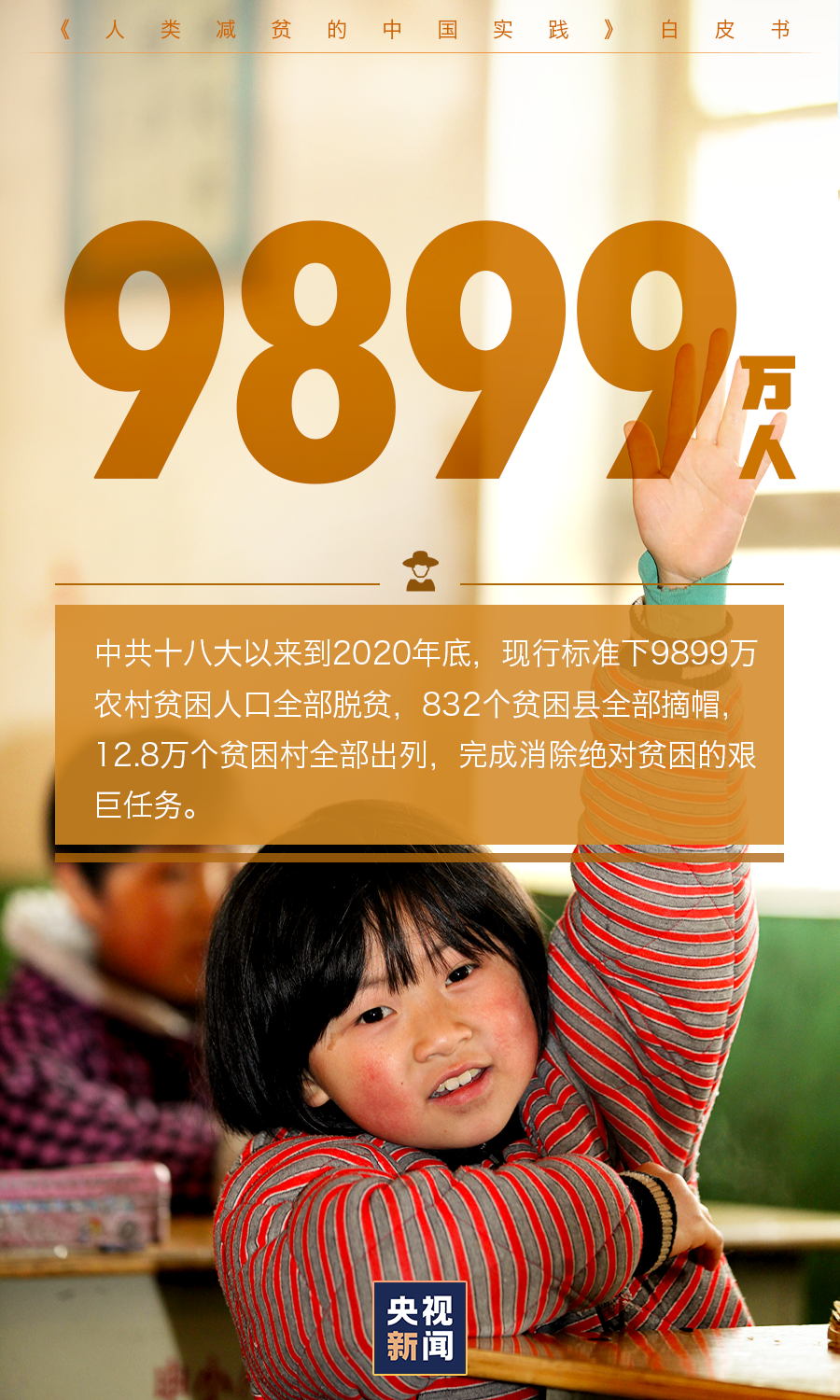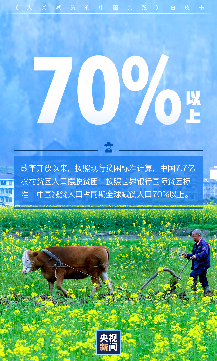 国务院新闻办公室6日发布《人类减贫的中国实践》白皮书,3万余字的白皮书全景式反映了中国减贫事业的发展。改革开放以来,按照现行贫困标准计算,中国7.7亿农村贫困人口摆脱贫困;按照世界银行国际贫困标准,中国减贫人口占同期全球减贫人口70%以上。“贫穷不是命中注定,贫困并非不可战胜。”一组数据,看中国减贫成就↓↓↓