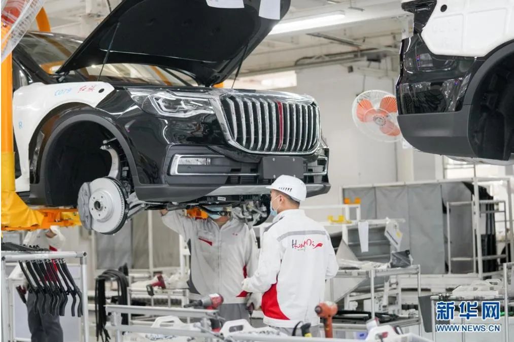 在位于吉林长春的一汽红旗工厂总装车间,工人在装配车辆。颜麟蕴摄(新华社)