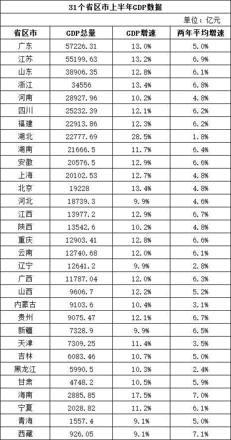 31省区市上半年GDP数据。制表:王震