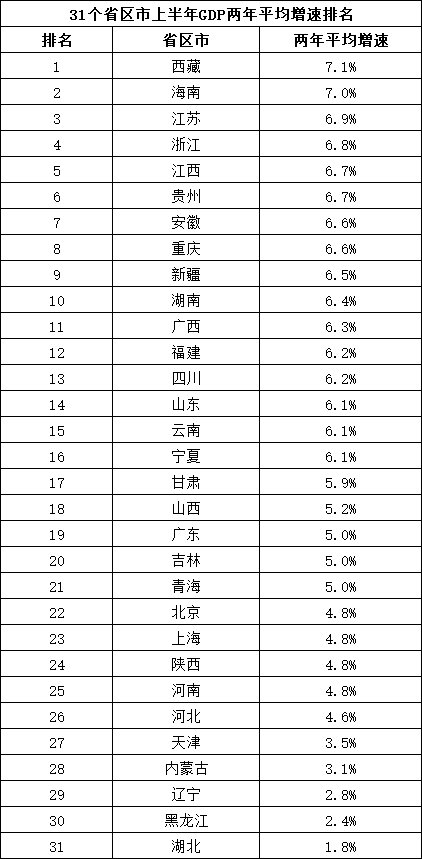 31省区市上半年GDP两年平均增速排名。制表:王震