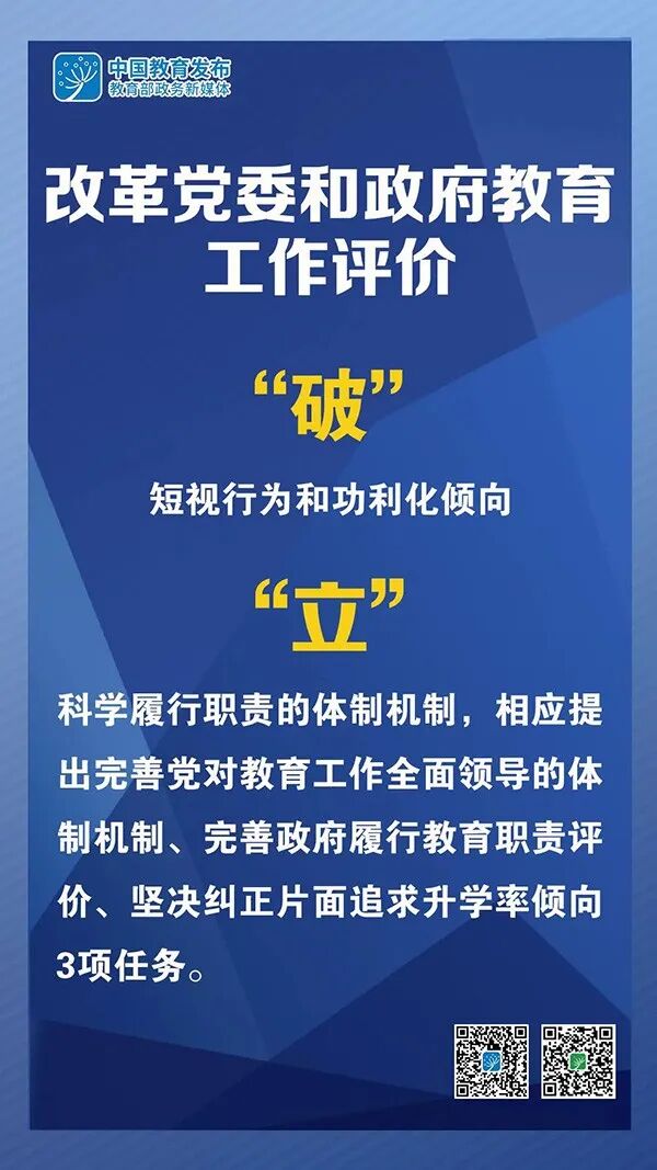 二是改革学校评价。“破”的是重分数轻素质等片面办学行为,“立”的是立德树人落实机制,相应提出坚持把立德树人成效作为根本标准、完善幼儿园评价、改进中小学校评价、健全职业学校评价、改进高等学校评价5项任务。