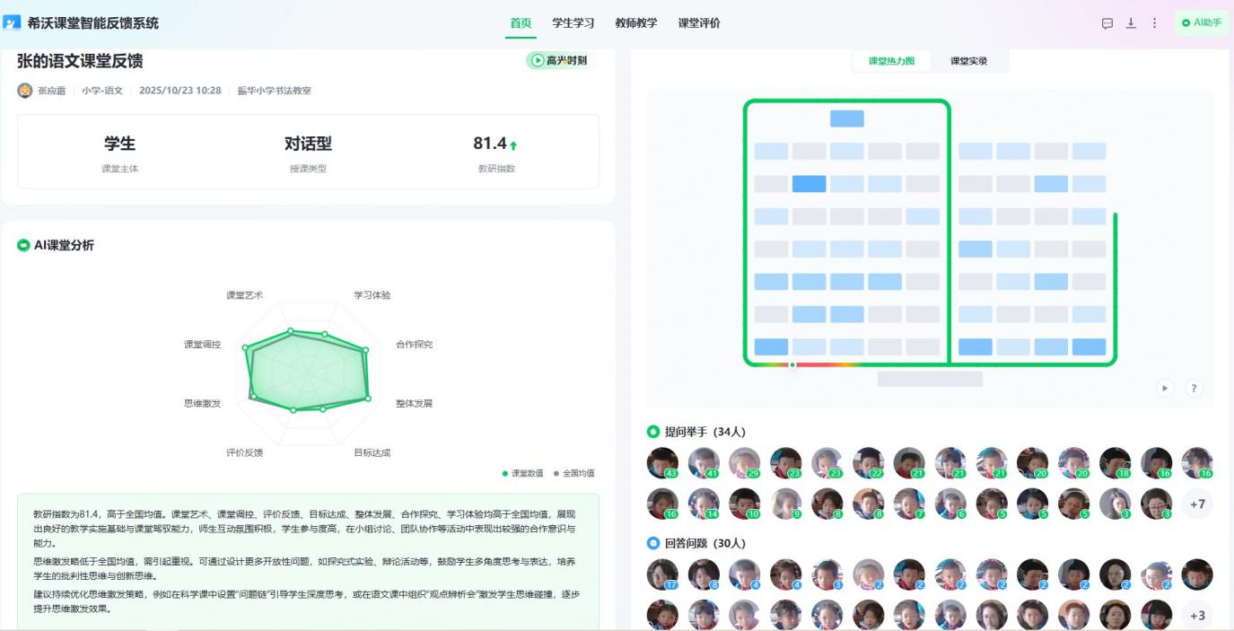 当天,张应霜老师的《彩虹》课在录播室开讲。40 分钟的课堂上,AI 系统通过无感知采集技术,实时捕捉师生互动的每一个细节 —— 从教师 3.3 字 / 秒的语速,到 34 名学生的举手频率;从 14 分 53 秒的师生问答时长,到 75% 的平均抬头率,数据被同步记录、智能分析。课后生成的反馈报告,如同一份精准的 “教学体检单”,清晰呈现课堂全貌。