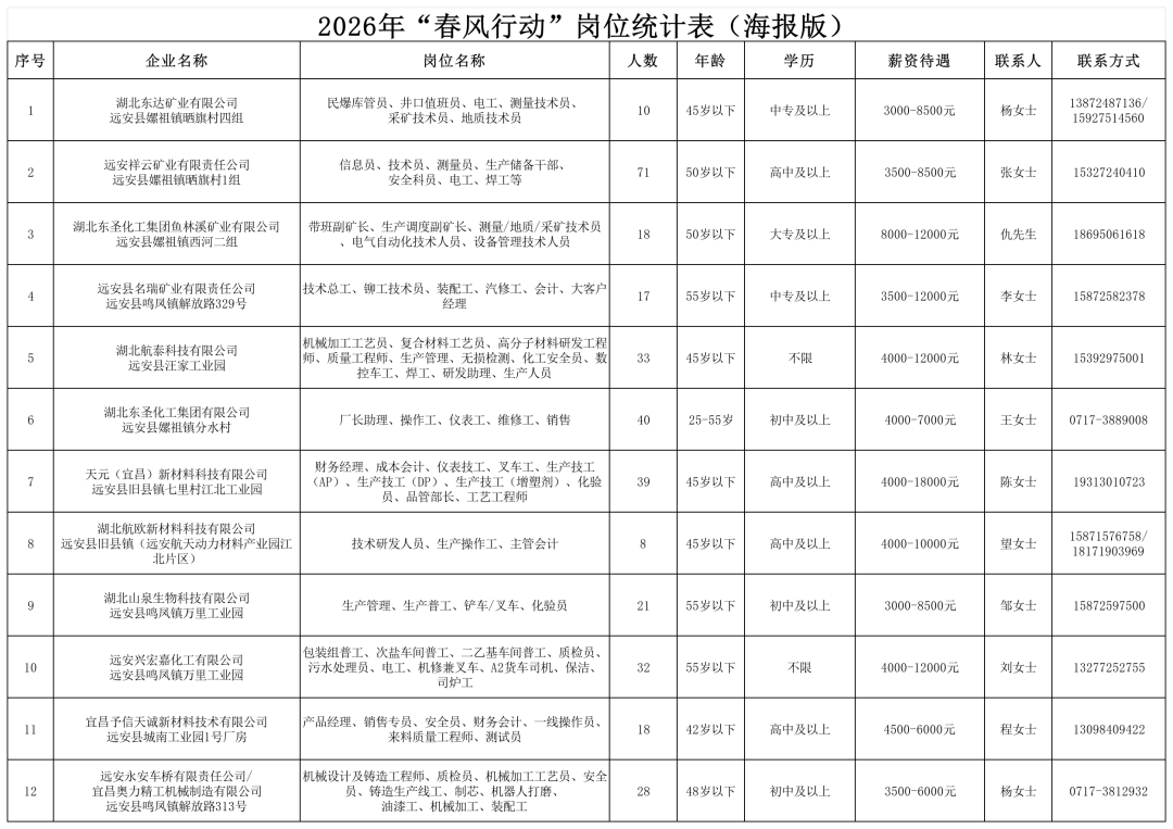 远安县2026年“春风行动”部分企业名单