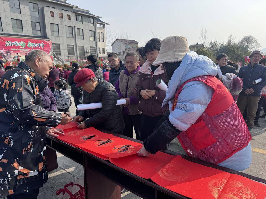 活动现场,锣鼓铿锵,醒狮欢腾。由当地村民组成的舞狮队穿梭在人群中,腾挪跳跃,引得喝彩连连,顷刻间点“燃”现场的年味儿。一旁,长桌早已铺就,几位本土书法老师挥毫泼墨,笔走龙蛇间将新春吉庆落入红纸,墨香伴着欢腾,为家家户户送去了真挚的新年祝福。